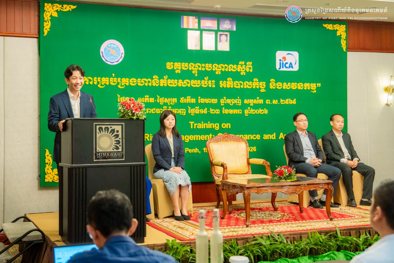 រាជធានីភ្នំពេញ៖ រសៀលថ្ងៃទី២៣ ខែមករា ឆ្នាំ២០២៦ ឯកឧត្តម ខូវ មករា រដ្ឋលេខាធិការក្រសួងប្រៃសណីយ៍និងទូរគមនាគមន៍ បានអញ្ជើញអធិបតីបិទវគ្គបណ្ដុះបណ្ដាលស្ដីពី “ការគ្រប់គ្រងហានិភ័យសាយប័រ៖ អភិបាលកិច្ច និងសវនកម្ម” នៅសណ្ឋាគារហ៊ីម៉ាវ៉ារី រាជធានីភ្នំពេញ ដែលមានការអញ្ជើញចូលរួមពីមន្ត្រី និងបុគ្គលិកជំនាញមកពី ៣៥ ក្រសួង-ស្ថាប័នរដ្ឋពាក់ព័ន្ធ និយ័តករ ប្រតិបត្តិករហេដ្ឋារចនាសម្ព័ន្ធព័ត៌មានសំខាន់ៗ ប្រតិបត្តិករសេវាអ៊ីនធឺណិត និងធនាគារ សរុបប្រមាណ ៥០រូប។